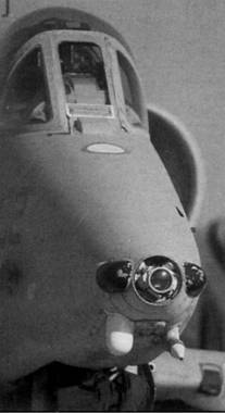 Вид на носовую часть А-4М: в центре ТВ- камера с лазерным отметчиком, по бокам – антенны системы предупреждения о радиооблучении, ниже – антенна системы РЭБ