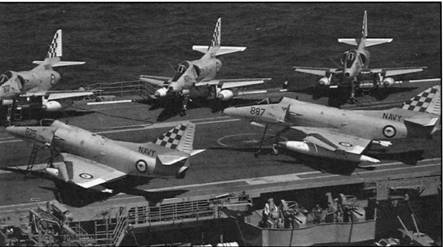 Первоначально на английских авианосцах (кроме «Melbourne», сразу получившего газотурбинные самолеты) базировались поршневые истребители-бомбардировщики Хоукер «Си Фьюри». В 1954 году их сменили реактивные всепогодные истребители Дэ Хэвилленд F.A.W.53 «Си Веном». А в октябре 1965 года правительство Австралии объявило о намерении перевооружить авиакрыло авианосца «Мельбурн» новыми, более современными самолетами. Это решение мотивировалось растущей угрозой со стороны Индонезии, оснастившей свою авиацию сверхзвуковыми истребителями МиГ-21 и дальними бомбардировщиками Ту-16.