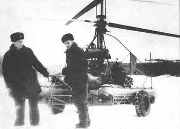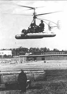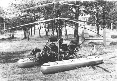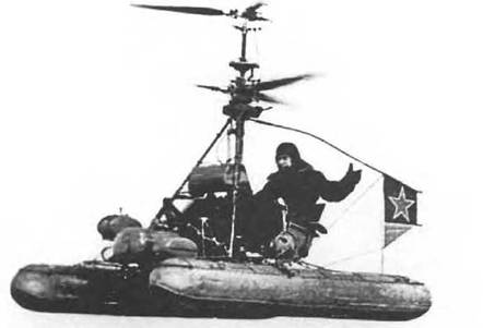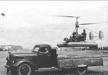 и первой машиной такого класса, поступившей на вооружение. Американцам потребовалось 10 лет для того, чтобы скопировать вертолет Камова и довести его до уровня серийного производства. Их «Джайродайн» XRON-l был почти точной копией Ка-8, с той лишь разницей, что имел шасси вместо поплавков, да место пилота перенесли в носовую часть вертолета, отодвинув мотор за стойку валов несущих винтов. Вертолет производили мелкими сериями различной модификации для ВМС и морской пехоты США в 1960-61 гг. Дальнейшего развития он не получил. Конструкция автомата перекоса получилась у американцев очень сложной и часто отказывала.Ка-10М, подготовленный камовцами для показа на воздушном параде в 1953 г.