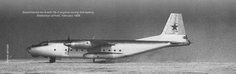 Опытный Ан-8 с двигателями ТВ-2Т во время первых рулежек. Аэродром Святошин, февраль 1956 г.