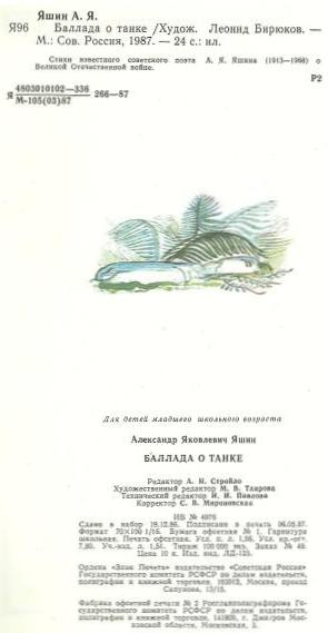 Я96 Баллада о танке /Худож. Леонид Бирюков. М.: Сов. Россия, 1987. — 24 с.: ил.