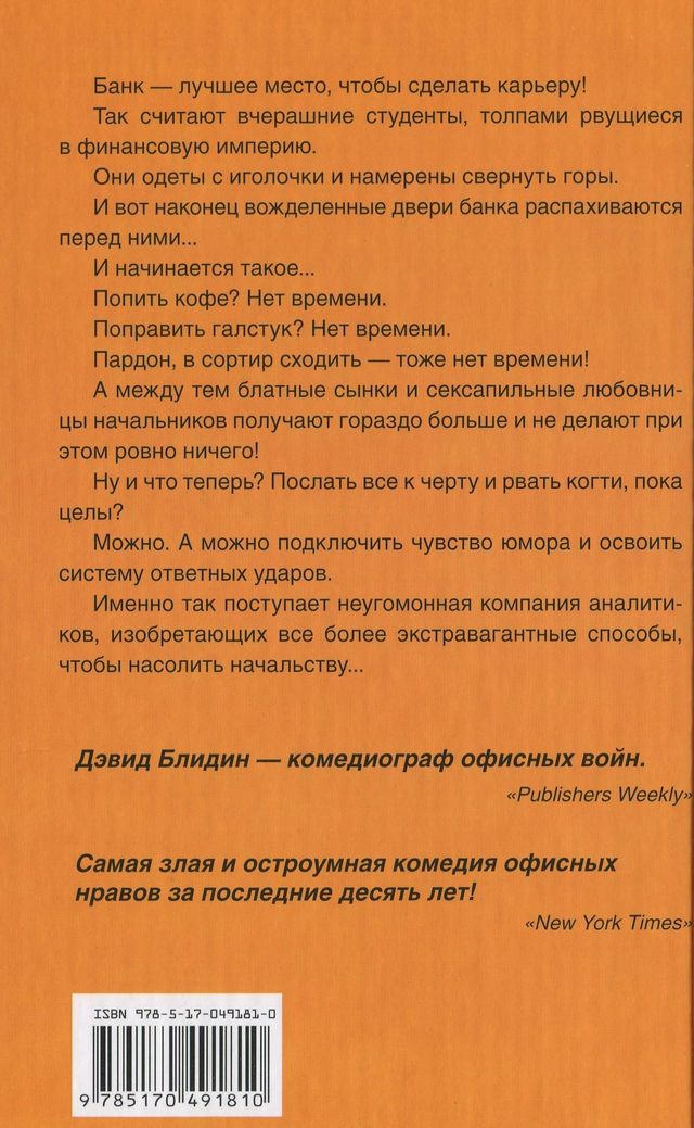 Несмотря на самые скромные мои намерения, события развивались совершенно неожиданным образом: друзья переслали мейл своим друзьям, те, в свою очередь, — своим, и однажды мое письмецо попалось на глаза Саманте Грайс, репортеру «Нэшнл пост», которой показалась интересной идея расширить этот крик души по электронной почте до размеров газетной статьи о рабском труде банковских «белых воротничков». Статья была напечатана в «Нэшнл» на первой странице раздела «Искусство», с карикатурой на мои оттопыренные уши. Онлайновая версия статьи стала популярной ссылкой в блогах по всему миру; собратья-аналитики в разных странах читали ссылку и наперебой выговаривались о том, как им тоже приходится сидеть на работе ночами. Эти интернет-страшилки в конце концов достигли ушей Мэтта Макгоуэна из литературного агентства «Фрэнсис Голдин», который сказал мне: «Дейв, я ничего не могу тебе обещать, к тому же это огромный труд, но будет просто здорово, если ты сделаешь из этого мейла роман».