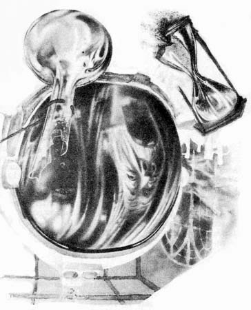 Сводчатый потолок комнаты покрывали паутина и мрак. Перламутровые завесы паутины сплетались в серый узор. В поздний ночной час тьме не было покоя в этом пристанище науки. Ее то и дело спугивали желтые, сине-зеленые или красные вспышки, отблески пламени на сводах над очагом. Перед ним среди тигельков и реторт бегал мелкими шажками старик.