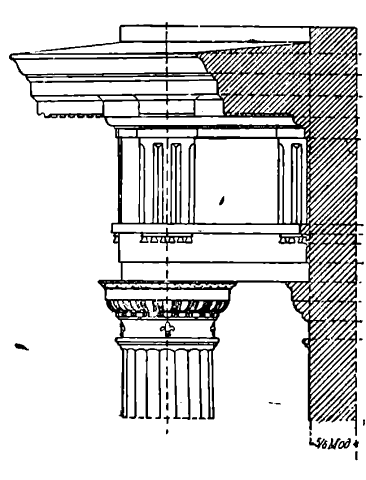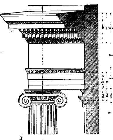Ионический ордер— более легкий, нежели дорический (см.), характерен тонкой и высокой колонной, с более глубокой каннелюрой (см.). Колонна покоится на вычурной базе (подставке) и имеет капитель (см.), снабженный завитками. Фриз (см.) антаблемента обычно сплошь заполняется непрерывной скульптурной композицией.