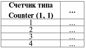 Значения данных типа счетчик генерируются автоматически при вставки строк. Причем эта генерация проводится без повторений, так что счетчик всегда будет уникально идентифицировать каждую строку. Но это создает некоторые неудобства при работе с таблицами, содержащими данные типа счетчик. Если, например, данные в отношении, заданном таблицей, изменятся и их придется удалить или поменять местами, значения счетчика легко могут «спутать карты», особенно если работает неопытный программист. Приведем пример, иллюстрирующий подобную ситуацию. Пусть дана следующая таблица, представляющая какое-то отношение, в которую введены четыре строки: