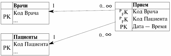 Эта диаграмма буквально означает, что в больнице имеется много врачей и много пациентов, и больше никак отношения и соответствия между врачами и пациентами не отражено. Таким образом, разумеется, что с такой базой данных в администрации больницы никогда не было бы понятно, как проводить приемы у различных врачей различных пациентов. Ясно, что использованные здесь связи типа «многие ко многим» просто необходимо детализировать, чтобы конкретизировать отношения между различными врачами и пациентами, другими словами, чтобы рационально организовать расписание приемов всех имеющихся в больнице врачей и их пациентов.