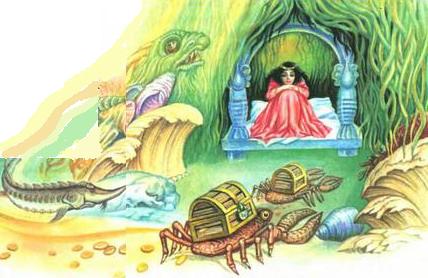 Два толстых осетра с позолоченными хвостами хотели надеть ей на голову корону, украшенную бесценными алмазами. Но Белоснежка оттолкнула их, и корона, звеня, покатилась по хрустальному полу.