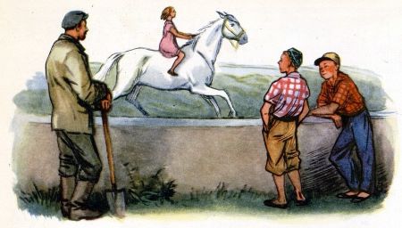 Я подошёл — конь высокий! Как на такого взлезть? И на месте не стоит, перебирает ногами; может, лягаться хочет? А ну его!
