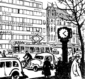 Светло-коричневое здание в глубине улицы казалось декорацией, несмотря на две мощные круглые башни с напоминающими короны ярко-зелеными медными крышами. На небольшом возвышении – спасительном островке в бурном потоке уличного движения – стоял растрепанный Оке, поглядывая на большие часы между башнями. Вот уже пять минут он безуспешно пытается улучить момент, чтобы проскочить на тротуар.