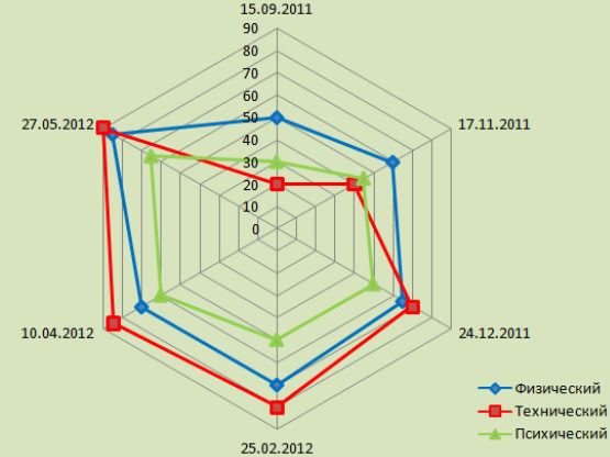 Показатели всех видов упражнений складываются и дают итоговое значение уровня физической подготовки занимающихся в настоящее время.