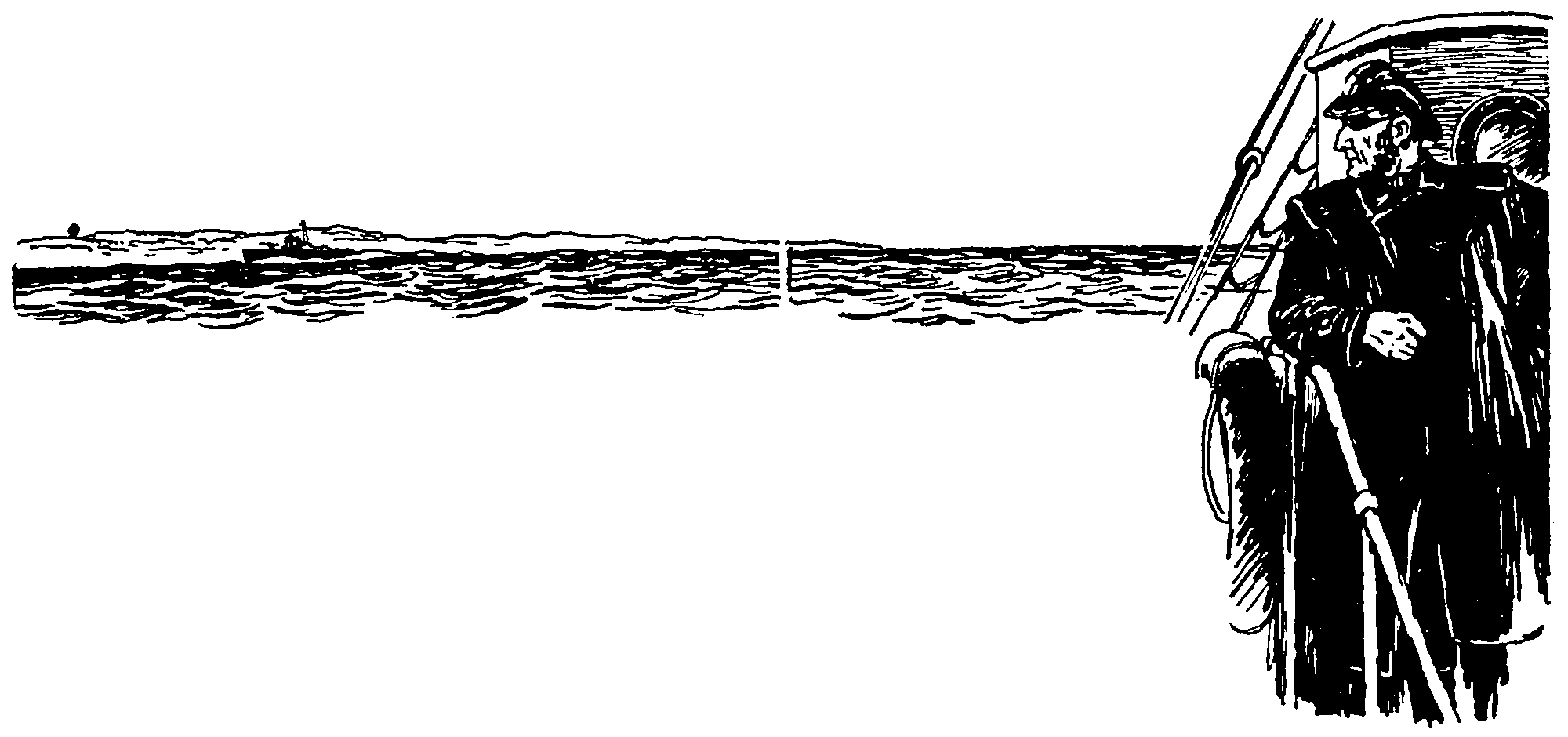 Ровная сиреневато-синяя линия его делила даль на две части. По белесому небосводу поднималось, слепя глаза, веселое утреннее солнце. Ниже лениво колыхалась вода — вода без конца и края. Темная у берегов, к горизонту она светлела, и, если бы не сиреневатая черта, трудно было бы отличить, где кончается блеклое море и начинается небо. Но линия была, и когда на ней появилась крохотная, еле заметная простым глазом темная точка, дальномерщик обернулся и вполголоса отрывисто доложил: