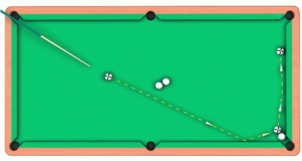 Этот удар применяется тогда, когда биток и шар-мишень располагаются близко от луз и бортов. При этом ударять следует не «в лоб» прицельному шару, а в его боковую часть с таким расчетом, чтобы сделать им промежуточный дуплет, после вторичного столкновения положить его в лузу, биток же отвести далеко назад от лузы.