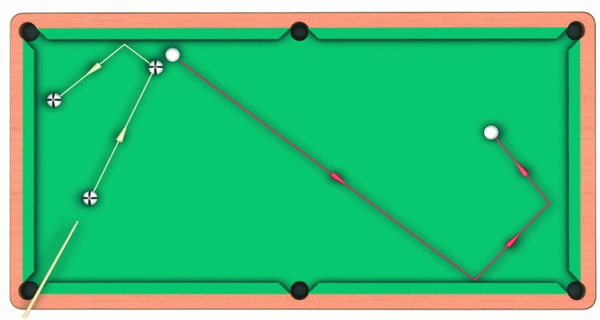 В другом варианте абриколя «свой» шар, отразившись вначале от борта, а затем от шара или от шаров, сыграет в лузу.