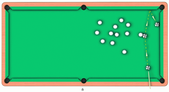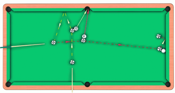 Предположим, что «двенадцатый» шар находится у длинного борта, а «туз» – у ближайшего короткого. В этом случае следует играть «туза» ударом средней силы, после чего биток отразится от длинного борта и «двенадцатый» можно будет легко положить в тот же угол.