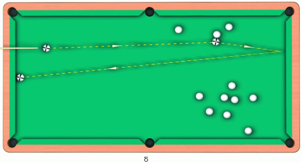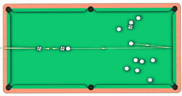 Отыгрыш тонким тушем можно провести и через весь бильярд. При этом биток не должен запутаться в шарах или стать на хорошую для кладки шаров позицию, а для этого проводка должна быть очень аккуратной.