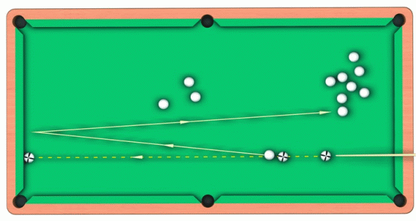Этот вид отыгрыша очень красив и эффектен, но требует большого умения и мастерства. Его можно применять в тех случаях, когда шар-мишень располагается у короткого борта, а «свой» удален от него на весьма значительное расстояние и находится в районе середины стола. Этот отыгрыш выполняют сильным накатным ударом. Биток прибивает прицельный шар к борту, а сам отталкивается от «чужого» и уходит назад.