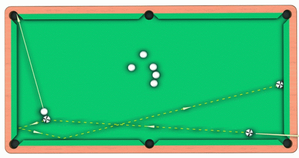 В начальной стадии партии обычно чересчур рискованно выводить «свой» шар из-за пирамиды. Поэтому биток обычно пускают легким, тихим ударом, чтобы он задел один из шаров пирамиды, затем отразился бы от длинного борта и стал вплотную к короткому, то есть приобрел бы положение, невозможное для сыгрывания шаров.