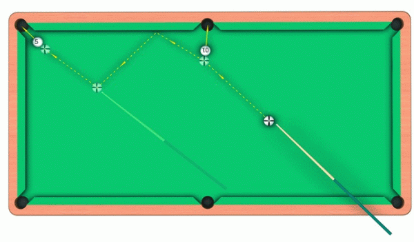 Другой пример. «Десятка» находится на резке в правую середину, а «пятерка» – около угла правого борта. В этом случае нужно сначала резать шар тихим ударом в среднюю, тогда биток выйдет под «пятерку».