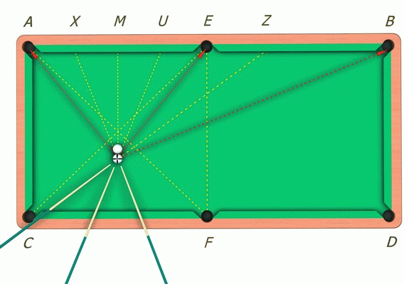 Для решения задачи нужно через центры «своего» и «чужого» шаров провести прямую линию, параллельную короткому борту игрового стола – точка M. После этого необходимо поделить пополам отрезок AM. Полученная точка X будет являться точкой прицеливания при ударе и кладке битка в лузу A. После этого следует поделить пополам отрезок ME. Точка U – точка прицеливания при кладке битка в лузу E. Точка Z, полученная в результате деления отрезка MB пополам, является точкой прицеливания для сыгрывания битка в лузу B.