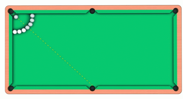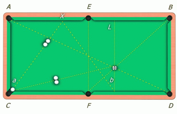 От угловой лузы на расстоянии, равном 1/3 длины борта от одной лузы до другой, следует вверх и вниз отложить две точки A и B. Эти точки нужно соединить цепочкой из семи шаров. Необходимо установить, сколько из семи шаров окажутся сыгранными и какой для этого нужно использовать удар.