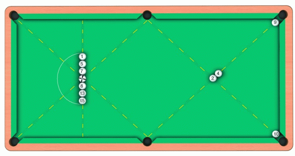 По условию задачи «свой» шар необходимо установить в 1-й точке стола. По обе стороны от него по прямой, параллельной короткому борту, выставляются по три шара: слева – «единица», «пятерка» и «семерка», справа – «восьмерка», «тринадцать» и «пятнадцать». Далее из точки центра битка нужно прочертить полукруг, радиус которого равен сумме диаметров 3,5 шара. На 3-ю точку стола выставляют «двойку», а близко к ней, на линии угловой лузы, помещают «четверку».