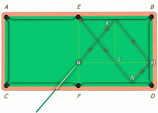 Удар по битку нужно делать, направляя шар в точку K. Вследствие этого биток, предварительно отразившись от трех бортов стола, пойдет в направлении лузы E и упадет в нее.