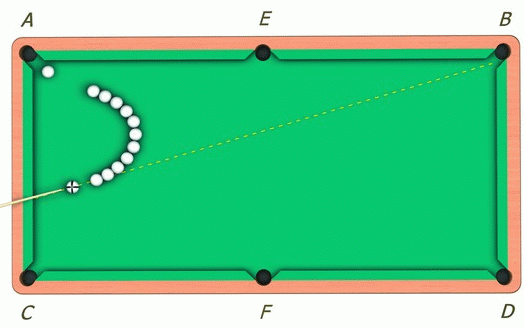 Битком необходимо нанести удар в шар, лежащий на коротком конце параболы, направляя его в лузу B. В результате действия закона передачи силы упругие шары начнут сдвигаться и столкнут последний шар, стоящий на длинном конце параболы, в лузу A.