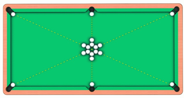 11 играемых шаров выставляются в виде дуги, вытянутой в направлении к угловой лузе, где находится 12-й шар.