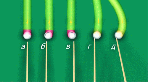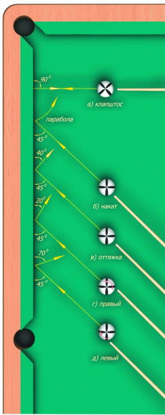 Примеры б и в наглядно демонстрируют, как в результате боковых ударов биток сначала