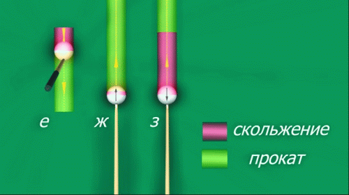 На рисунке можно увидеть, насколько велик путь скольжения и качения «своего» шара, а также действие эффе при простых и боковых ударах.