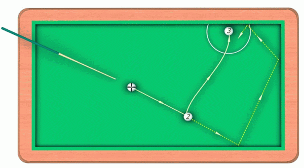Игрок бьет «свой» шар нижним правым боковиком, чтобы биток ударил «двойку», после чего пошел направо практически под прямым углом. Биток должен пройти путь, почти равный ширине бильярдного стола, и ударить «тройку». Здесь есть небольшая хитрость: надо вообразить, что «тройка» находится не у правого борта, а примерно на середине линии между «двойкой» и «тройкой». В этом случае решение данной задачи станет значительно легче.