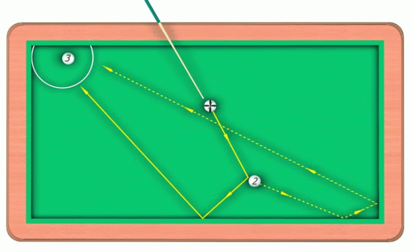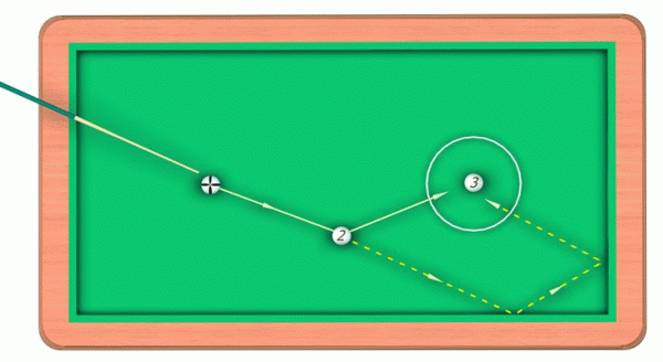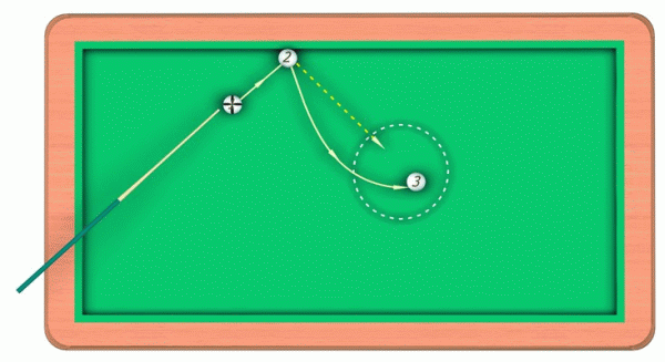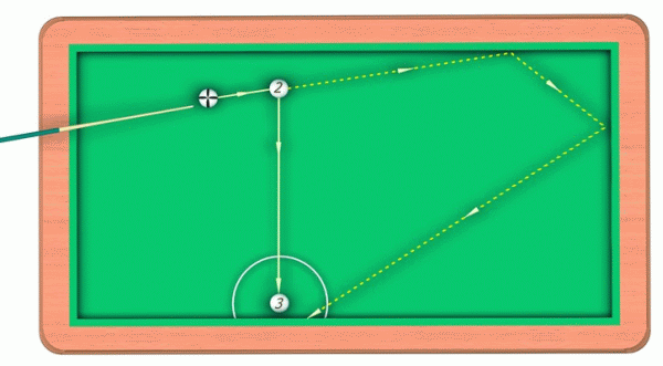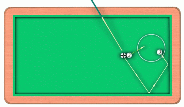 Игрок делает длинный мягкий удар, применяя левый боковик. В результате этого «двойка» слегка продвигается внутрь окружности, влево. В то же время «свой» шар отражается от бортов дважды и несильно бьет «тройку».