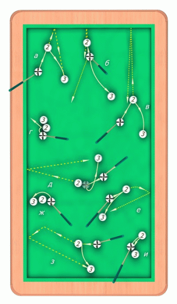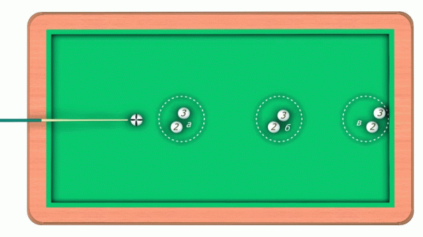 В первоначальном положении «тройка» стоит вплотную у длинного борта, рядом с углом бильярдного стола. Если мысленно провести от нее линии к «своему» шару и «двойке», то получится тупоугольный треугольник. Нужно, чтобы после одного удара все три шара собрались в районе «тройки».