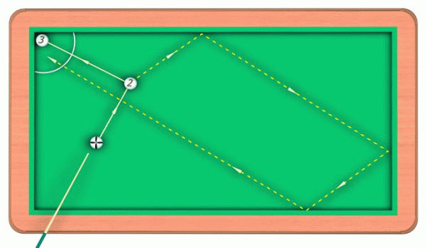 Данное упражнение нужно для совершенствования прямого карамболя, при котором происходит трехкратное отражение «двойки» бортовой резиной.