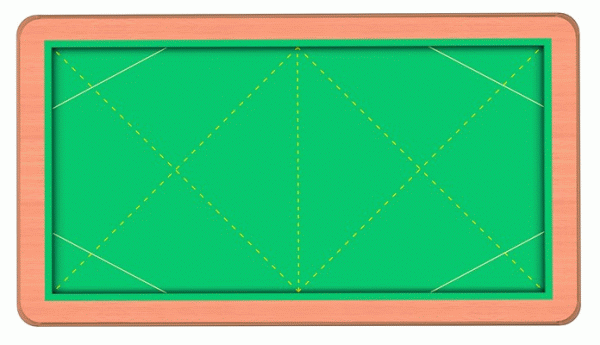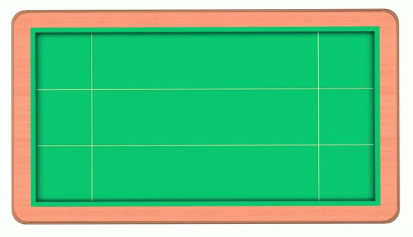 Для этой партии на поле стола должно быть представлено девять зон, а именно: шесть квадратов (по три у обоих коротких бортов), каждый со стороной 47 см, и три прямоугольные зоны.