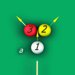 В случае, если расстояние между ставшим у борта «своим» шаром и «двойкой» будет несколько меньше, а между шарами «1» и «3» чуть больше их диаметра, то, чтобы удалить от борта все шары и сохранить так называемую внешнюю позицию (то есть когда биток располагается на свободной части поля по отношению к прицельным шарам), «свой» посылают вперед накатным ударом средней силы с таким расчетом, чтобы он последовательно коснулся «двойки» и «тройки», как на схеме г. Биток в этом случае практически беспрепятственно проходит между шарами и катится дальше; при этом возникает позиция, удобная для новых карамболей, то есть внешняя позиция занимается за счет прохода битка между шарами.