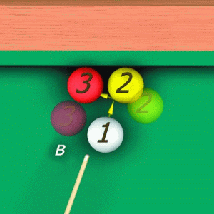 Есть и второй вариант в данной игре, а именно: шар должен отразиться от трех бортов, а затем игрок выполняет карамболь по двум прицельным шарам.