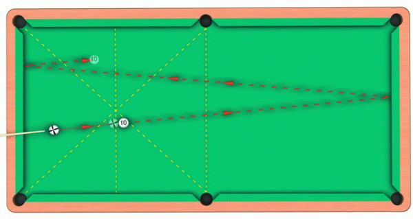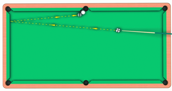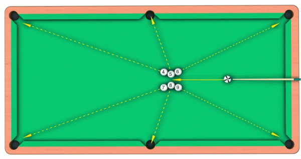 Для того чтобы продемонстрировать такой трюк, необходимо выставить «свой» шар на борт на некотором расстоянии от одной из угловых луз. Затем по битку нужно нанести довольно сильный удар и послать его в противоположный угол.