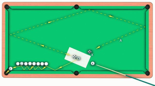 Для того чтобы провести такой трюк, необходимо нанести по битку такой удар, вследствие которого тот, отразившись от короткого борта стола под острым углом, пойдет к прицельному и положит его в среднюю лузу.