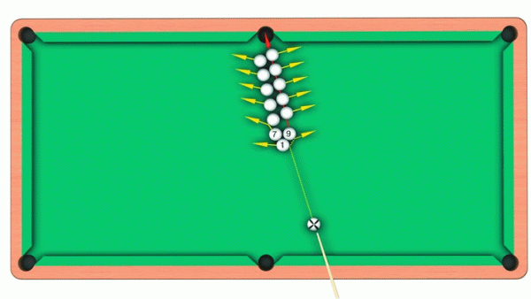 Для выполнения трюка шары расставляют так, как показано на рисунке. Необходимо нанести такой удар по стоящим рядом шарам «единице», «семерке» и «девятке», чтобы «свой» шар, столкнувшись с «девяткой», положил ее в лежащую напротив среднюю лузу. После удара биток разобьет группу из трех шаров, в результате чего «семерка» направится в первые два шара цепи и сдвинет их с места. Вследствие цепной реакции придут в движение и другие шары, составляющие цепочку.