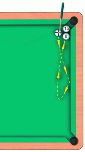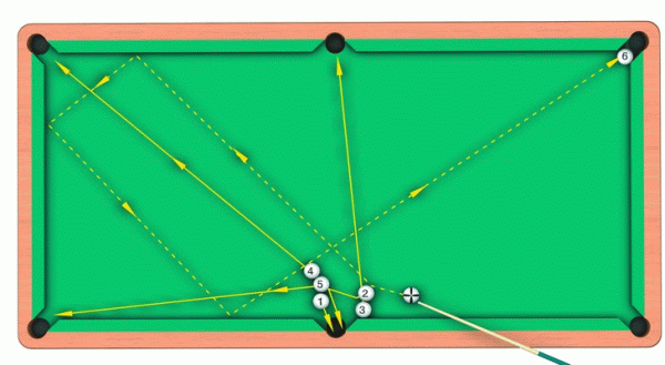 В результате проведения левого боковика «свой» шар отразится от трех бортов, затем направится вверх к угловой лузе, после чего возвратится назад и столкнет «тройку» в среднюю лузу.