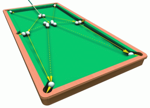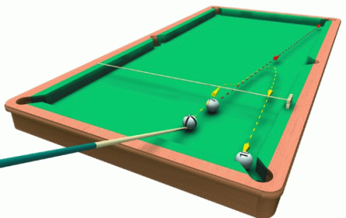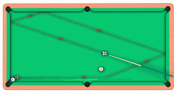 Перед началом выполнения трюка спортсмен должен объявить о том, что может положить «восьмерку» от битка, который отразится от трех бортов стола и не стушует при этом «тройку», стоящую в точке, показанной на рисунке.