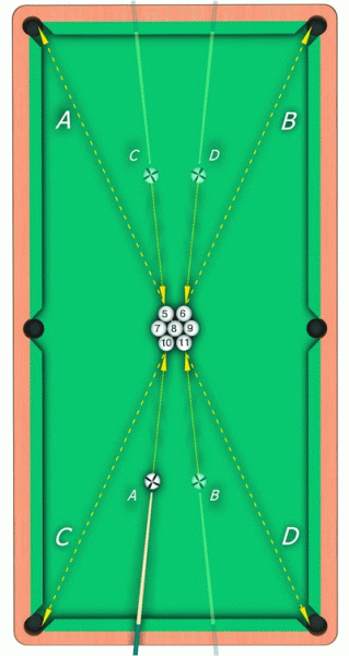 В том случае, если необходимо положить шар «8» в угловую лузу С, нужно выставить «свой» в точке C, после чего нанести сильный удар в направлении «пятерки». Вследствие удара шары «7» и «10» раскатятся в разные стороны, а «восьмерка» пойдет в назначенную лузу после туша с «одиннадцатым».
