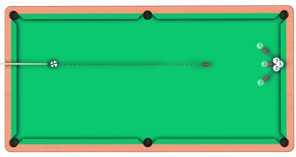 «Туза» и «двойку» выставляют близко к короткому борту, а «тройку» – поверх их. «Свой» шар размещают на противоположной стороне бильярда. Сущность трюка заключается в том, чтобы сбить «тройку», не стушевав при этом «двойку» и «единицу».