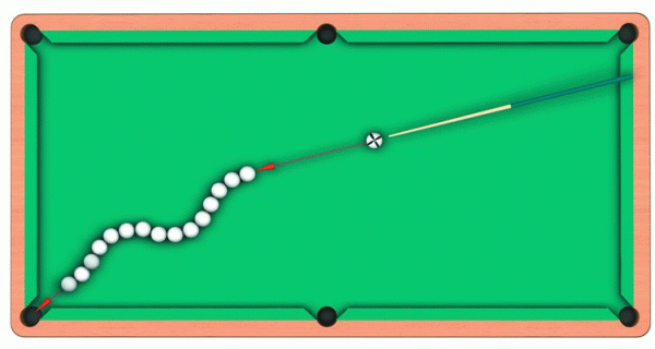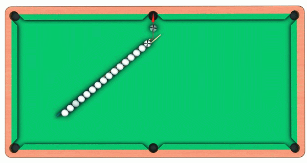 Выполняя трюк, необходимо битком нанести достаточно сильный удар по последнему шару цепочки. В результате все 15 шаров окажутся в назначенной лузе.