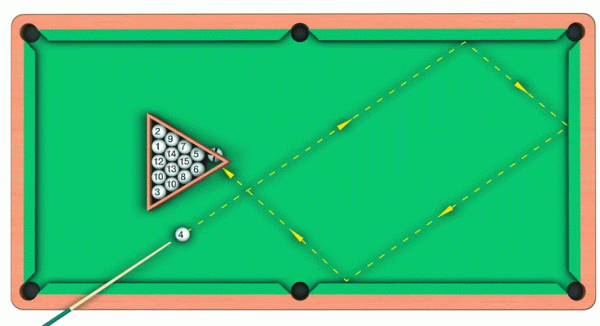 Шары расставлены в пирамиду без учета номеров. Биток прижат треугольником так, как показано на рисунке. «Четверку» нужно послать в сторону противоположного длинного борта таким образом, чтобы она, отразившись от трех бортов, выбила «свой» шар и встала в пирамиду.