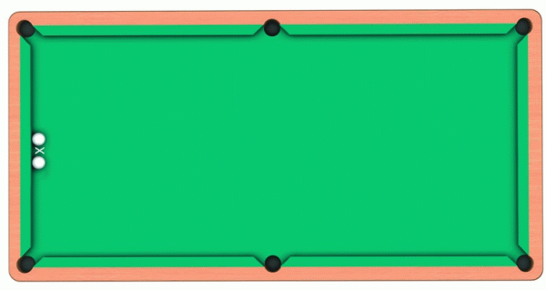 Два шара выставлены у середины короткого борта. Шары находятся на расстоянии в полшара друг от друга. Суть фокуса состоит в том, чтобы положить шары в разные угловые лузы ударом «с руки». Для того чтобы провести трюк, необходимо нанести удар в направлении точки X, подняв шар на высоту примерно 15–20 см.