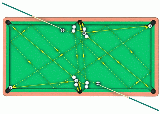 Находясь с разных сторон бильярда, игроки наносят удары, загоняя шары в лузы. При этом прицельные шары движутся во всех направлениях. Для успешного проведения трюка мастера кия советуют использовать картонные трубки, на которых и устанавливают «двойку» и «четверку».