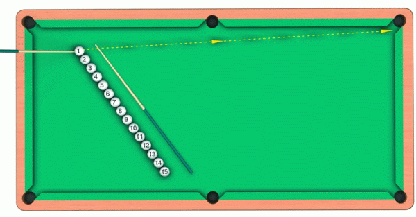 Для выполнения трюка необходимо выставить шары на столе так, как показано на рисунке. Затем вдоль цепочки шаров нужно положить кий. Задача игрока состоит в том, чтобы положить шары через кий в дальнюю угловую лузу.