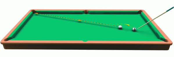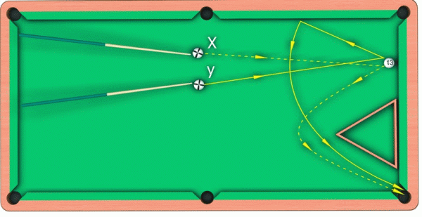 Существует и второй вариант выполнения данного трюка. Для этого биток располагают в точке Y, а удар наносят в левую точку шара. После наката шар пойдет в сторону длинного борта и, отразившись от него, направится к угловой лузе.